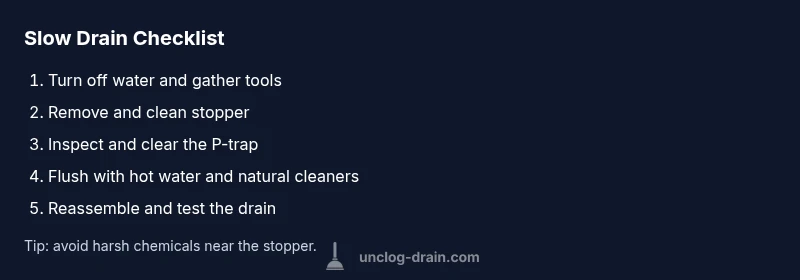Often the fastest solution is to remove and clean the stopper and linkage, then clear the P-trap if needed. Hair and soap film are the usual culprits, and a thorough cleaning resolves most slow-drain issues.