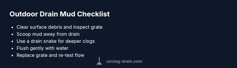 Mud can be carried into exterior drainage lines during heavy rain or after erosion. When mud settles at the grate, water backs up, pooling in your yard and around foundations. According to Unclog Drain, mud buildup is a common outdoor clog culprit in wetter months. The consequences go beyond inconvenience: damp soil invites mold and mosquitoes, and repeated blockages can stress landscaping and grading. Understanding how mud travels through the system helps you choose the right approach instead of applying quick but ineffective fixes. This section lays the groundwork with practical context, safety reminders, and a plan to restore flow quickly while reducing future risk.