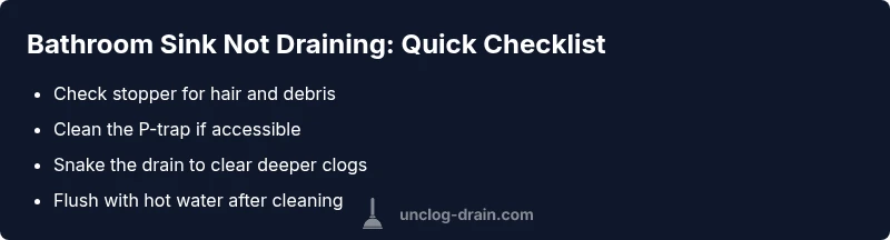Most bathroom sink not draining is usually a clog in the drain or P-trap from hair and soap scum. Start with the easiest fixes: clean the stopper, then plunge or use a drain snake to clear the line. If slow drainage continues, remove and clean the P-trap, then reassemble and test.