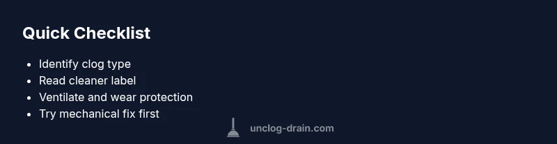 This section provides a safe, repeatable approach to unclogging with or without cleaners. Start with basic checks, identify the fixture, and decide on a plan. Always ventilate and wear protective gear. If you decide to use a chemical cleaner, follow the product label precisely and avoid combining multiple products. After attempting a cleaner, test the drain with a small amount of water to observe any improvement before proceeding to mechanical methods. If progress stalls, move to a mechanical approach or seek professional help.