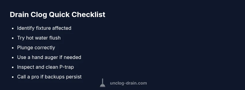 Not all blockages are the same. A sink or shower drain typically backs up first, while a toilet or main line clog may show slower drainage across fixtures. Start by observing which fixtures are affected and whether the water backs up, drains slowly, or gurgles. Look for a consistent pattern: if multiple fixtures are slow, the clog could be deeper in the main line or a venting issue. According to Unclog Drain, identifying the scope of the problem helps you decide between home remedies and professional service. If you’re unsure, begin with the easiest fix for one fixture to gauge how the system responds. Remember: never force water down a vent or overflow a blocked line; this can push waste into other areas and create a mess.