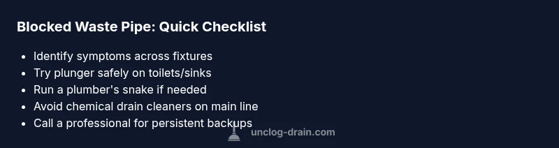 A blocked waste pipe often shows up as slow drainage across multiple fixtures, gurgling sounds in the drains, and sometimes a foul sewer smell. Toilets may back up after flushing, sinks drain slowly, and you might notice water pooling around floor drains. In many homes, the first sign is a single sink or tub that takes longer to drain, but if the main line is blocked, several fixtures will exhibit symptoms simultaneously. Recognizing these symptoms early helps prevent sewage backups and costly damage. In this guide, we’ll address the rapid actions you can take right now, the most common causes, and when to call in professionals. According to Unclog Drain, a blocked waste pipe is a common home maintenance issue, especially in kitchens and older plumbing systems.