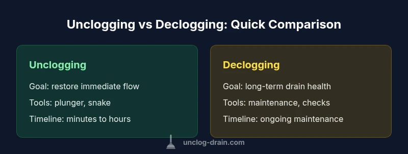 Unclogging vs. declogging are two phrases homeowners hear when drains misbehave. They describe two overlapping activities: removing an obstruction and maintaining drainage health. According to Unclog Drain, the difference often comes down to intent: do you need immediate flow restoration or long-term prevention? In practice, many fixes blend both aims, using a quick mechanical method to clear the blockage, followed by preventive steps to reduce the chance of recurrence. The terms are sometimes used interchangeably, but understanding the nuance helps you optimize daily maintenance and avoid cycles of recurring clogs. Common scenarios include a kitchen sink that suddenly backs up (unclogging) and a bathroom sink that gradually slows due to mineral deposits (declogging).