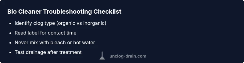 If you're wondering will bio clean unclog a drain, start with the simplest checks. The Unclog Drain team often sees mixed results because bio enzymes and bacteria-based cleaners work best on organic buildup in drainage lines, not on solid blockages like hair, grease, or foreign objects. In many homes, a slow drain is caused by organic buildup in the trap or pipe, where bio cleaners can gradually break down the sludge over hours to days. According to Unclog Drain analyses, these products are most effective when used as part of a regular maintenance routine rather than as an emergency cure. If you have a persistent clog, document the symptoms (sound, water level, time to drain) and proceed with a structured troubleshooting flow.