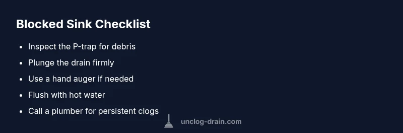 If your sink is clogged, start with the simplest fixes: plunge the drain, inspect and clean the P-trap, then use a drain snake if needed. If water continues to back up or drains slowly, stop and contact a blocked sink plumber for a professional diagnosis and safe removal. For safety, disconnect any disposal before working.