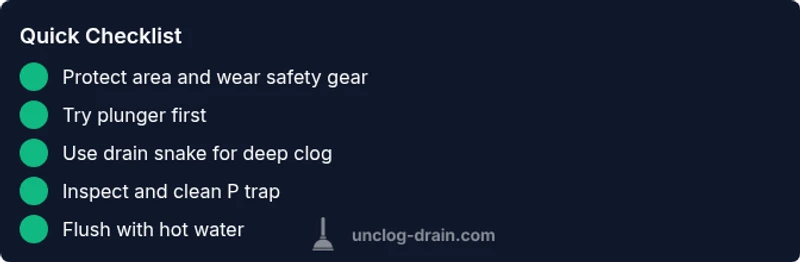 Start with a plunger to create pressure, then use a drain snake for deeper clogs. If this fails, inspect and clean the P-trap. Avoid chemical cleaners unless absolutely necessary.