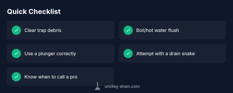 A clogged drain line is usually caused by hair, grease, or debris buildup in the trap or pipes. Start with a quick fix: flush with hot water or a baking soda-vinegar treatment, then try a plunger or a hand snake. If drainage remains slow, follow the diagnostic flow for deeper troubleshooting.