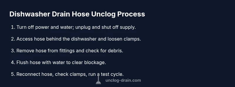 The goal is to remove the blockage, restore free flow, and verify there are no leaks after reassembly. Start by safely detaching the hose from both the dishwasher and the drain connection, then carefully remove the obstruction with hands or a flexible tool. Rinse the hose with water to ensure the flow is clear, and inspect for cracks or kinks that may require replacement. Finally, reattach the hose securely, turn the water and power back on, and run a short cycle to confirm normal operation. If the flow remains restricted, the issue may lie further along the drain path, such as the sink trap or disposal, and may require additional checks.