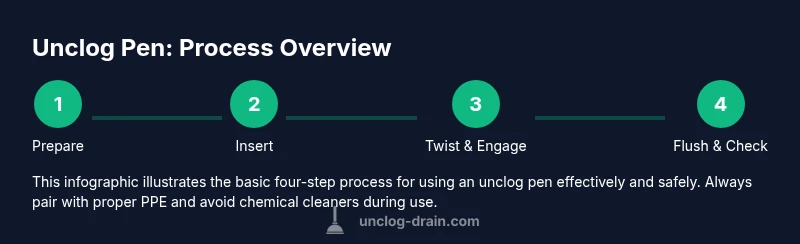 An unclog pen is a slim, pen-like drain tool that uses a flexible wire or coil at the tip to reach and dislodge light blockages in household drains. It’s designed for quick, chemical-free intervention on typical household clogs such as hair, soap scum, and food debris in sinks, showers, and some bathtubs. According to Unclog Drain, the pen’s compact form makes it easier to maneuver in tight pipe bends than larger tools, reducing the need for harsher methods. Use it for minor blockages that respond to mechanical action rather than chemical dissolution. If a clog is stubborn, deep, or accompanied by sewage backup, stop immediately and consider professional help. This tool is not intended for toilet clogs or pipes with fragile joints.