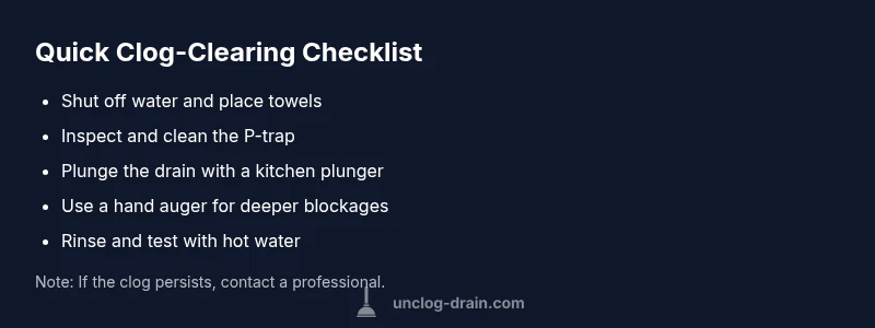 Follow these steps in order for the most common kitchen sink clogs: safety and prep, inspect and clean the P-trap, plunging, augering for deeper blockages, reassemble, and test. Expect this process to take about 45–60 minutes in a typical scenario. If you encounter leaks or persistent backing up, proceed to the more in-depth fixes outlined in the Step-by-Step guide below.