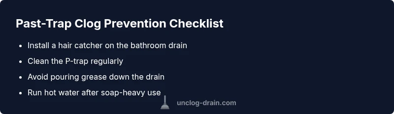 Use drain screens, avoid pouring grease, and clean the trap regularly to prevent debris buildup beyond the trap.