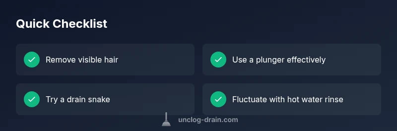 Begin with visible inspection: remove the strainer, clean the trap, and wipe away accessible hair. If water remains slow, attempt plunging. If plunging fails, use a drain snake to engage the clog from the trap area. Re-test drainage after each step. If the clog is still present, stop and consider professional help to avoid damaging pipes or septic systems. Regular maintenance afterward will prevent recurrence.