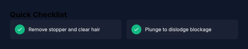 Immediate quick fixes you can try safely\n\nBefore diving deeper, try a few rapid, safe measures. Put on gloves, remove standing water if possible, and pull the stopper to clear visible hair. Use a plunger to create suction over the drain opening and work the blockage loose. If you have a drain snake or hand auger, insert it gently and rotate to dislodge the clog. Avoid chemical drain cleaners as a first option, particularly in enclosed bathrooms; they may damage seals or pipes and can emit strong fumes. After each step, run hot water to rinse away loosened material and re-test drainage. If you encounter resistance or the drain remains slow, move to the next method rather than forcing the blockage.