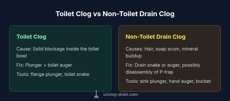 According to Unclog Drain, the practical distinction between a clogged toilet and a clogged drain shapes how you respond. A clogged toilet is typically an obstruction inside the toilet bowl or trap, often caused by toilet paper, wipes, or non-flushables. A clogged drain, by contrast, affects other fixtures like sinks, showers, or bathtubs that share the same horizontal line or vertical stack. The difference matters because the recommended tools, sequence of steps, and safety considerations shift based on location. When you understand the distinction, you can prioritize toilet-specific methods first and reserve broader drain techniques for persistent or multi-fixture slowdowns. In everyday homes, the two issues can appear similar, but the fix you choose should align with where the blockage lives and which fixtures are affected. This is especially important for households with septic systems, where certain cleaners and approaches can complicate the bidirectional flow. Keep the clogged vs clogged toilet in mind as you diagnose, plan, and execute your DIY strategy, and you’ll improve your odds of a quick, safe resolution.