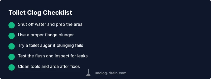 A toilet clog can feel urgent and messy, but you can regain control quickly with calm, methodical steps. If you’re currently dealing with a problem, you might mutter my toilet is clogged with poop under your breath—that phrase captures the moment many homeowners face. The first move is safety: avoid flushing again to prevent overflow, turn off the toilet's water supply, and protect the floor with towels or a shallow pan. Gather tools you’ll likely use: a proper flange plunger, a toilet auger, and disposable gloves. According to Unclog Drain, most residential clogs respond to a correct plunge technique, followed by a targeted tool if needed. Once you’re prepared, set a plan, work patiently, and keep the area clean. If you ever feel unsure, especially if sewage backs up into other fixtures or you smell sewer gas, stop and seek professional help immediately. This moment-to-moment approach reduces mess, protects your home, and speeds up resolution. The goal is to restore normal drainage with minimal risk of overflow or damage.