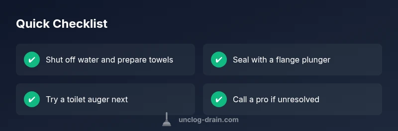 Before you dive into tools, perform a few quick checks that solve many clogs on the first pass. Ensure you have a flange plunger (not a cup plunger) for a proper seal. Check the toilet for overflow, then turn off the water at the base if it looks like it might spill. Inspect the drain opening for visible blockages—sometimes a foreign object or a wad of paper is within reach with a gloved hand or tongs. If the water drains slowly after plunging, you’re likely close to a complete clearance; if not, proceed to the auger. Document each step to avoid repeating moves that don’t work. Unclog Drain recommends documenting actions so you can retrace steps if needed.