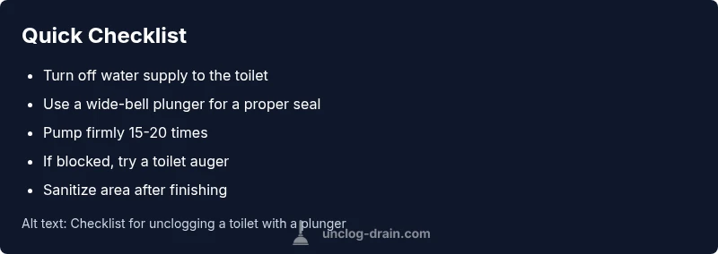 Below is a practical sequence to tackle the most frequent causes. Each step advances from easy to more involved, and includes a quick pro-tip to keep you moving. Step 1: Prep and safety — turn off the water supply, put on gloves, and clear the area. Tip: a fresh towel around the base helps catch splashes. Step 2: Verify the seal — inspect the plunger for cracks and ensure the rubber cup sits flush against the drain opening. Tip: wipe the edge clean for a better seal. Step 3: Plunge correctly — place the plunger, seal, and give 15-20 steady pumps. Tip: don’t rush, let suction build. Step 4: Reassess with the auger — if plunging fails, insert a toilet auger and rotate while pushing gently. Tip: avoid forcing; damage can occur. Step 5: Try controlled siphoning — carefully pour hot water with a squirt of dish soap from a height to create pressure waves. Tip: hot water can help but don’t scald. Step 6: Consider suction alternatives — a wet/dry vacuum can help remove standing water or lug out loosened debris, used with caution. Tip: keep the device away from the toilet seat. Step 7: When to call a pro — if nothing works after these steps, you may have a main-line issue or a severe blockage. Tip: early professional input can save time and prevent damage. Estimated time: 60-90 minutes.