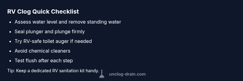 Start by removing water, then plunge. If needed, use an RV-safe auger and avoid chemicals.