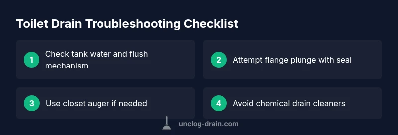 A toilet not draining with no visible clog is surprisingly common and can be alarming. You may flush and see water rise but barely drain, or you might hear gurgling from the drain or nearby fixtures. In many cases, the issue isn’t a hairball or toilet paper stuck in the rim—it's a partial obstruction further down the line, a venting problem, or a subtle main-line backup. Recognizing that the symptom can have multiple causes helps you choose safer, faster fixes and avoid unnecessary chemical cleaners that can harm your toilet or pipes. According to Unclog Drain analysis, most no-clog drain issues respond to mechanical fixes first, before escalating to professional service. Keeping a calm approach and following a step-by-step plan is essential when every minute counts around a potential overflow.