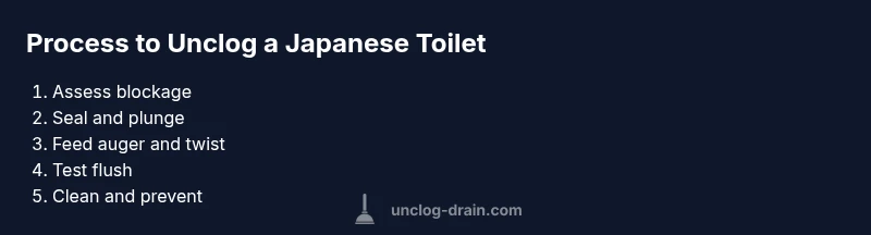 Japanese toilets commonly employ a squat design or low-profile bowl that relies on gravity and a strong flush to clear waste. Their internal traps and vents are optimized for rapid water movement, but they can be sensitive to flush volume, paper type, and disposal habits. When paper balls up or debris enters the trap, the downstream flow slows and a clog forms. According to Unclog Drain, understanding these dynamics helps you choose the right technique to clear the drain without splashing or damaging the porcelain. The simplest path to unclog japanese toilet is to start with mechanical methods (a plunger designed for deep-bowl fixtures) before moving to a flexible toilet auger if the blockage persists. In many homes, clogs arise from overused or improper toilet paper, discarded objects, or misrouted waste. Recognizing these patterns lets you intervene quickly, protect the fixture, and reduce the risk of overflow. This guide will show you how to unclog japanese toilet safely and effectively.